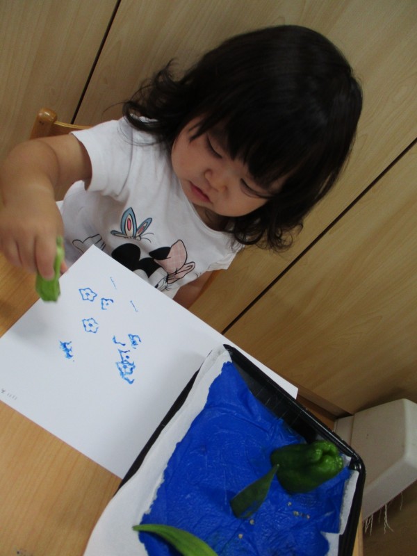 お気に入りの色を野菜スタンプにつけてチャレンジ!ナスのまんまる、オクラの星形・・・「みてみてー!」と嬉しそうに教えてくれました。