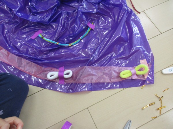 カラーポリ袋、画用紙、テープ、空き箱などを使って自由に作っていきます。