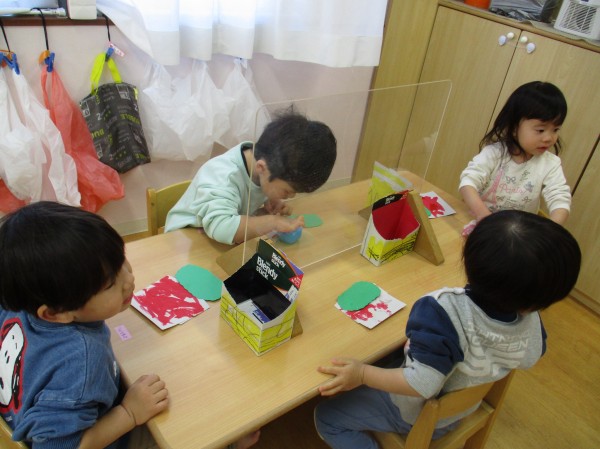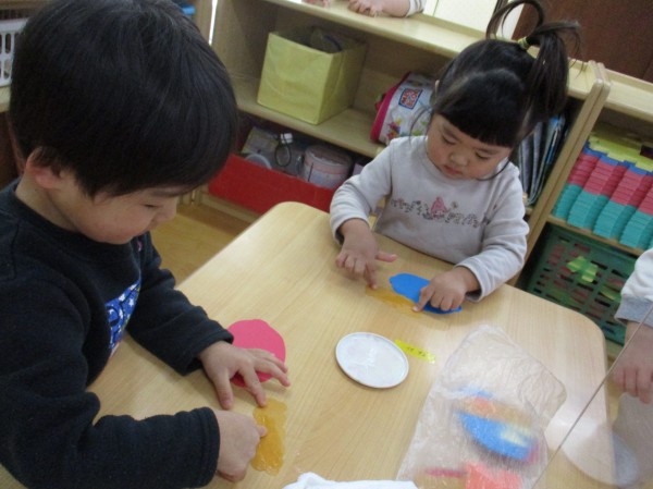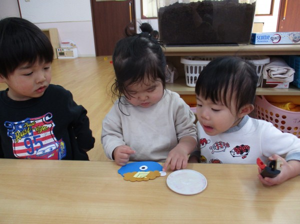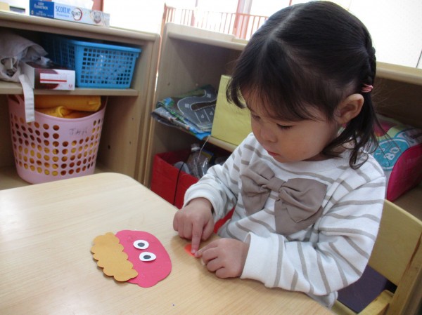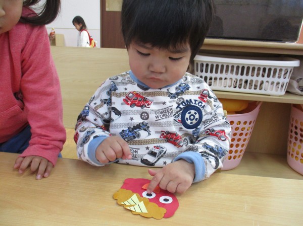 こちらはひよこ組。でんぷんのりを使って鬼の顔作り。パーツにのりを丁寧に塗って、真剣な表情です。