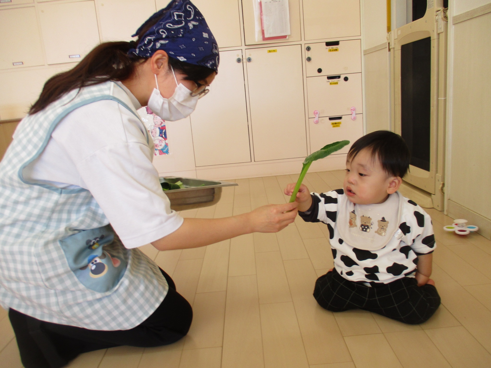 こどもの家・志木中宗岡 1月の食育 「小松菜に触れる☆彡」 たまご組(0歳児)