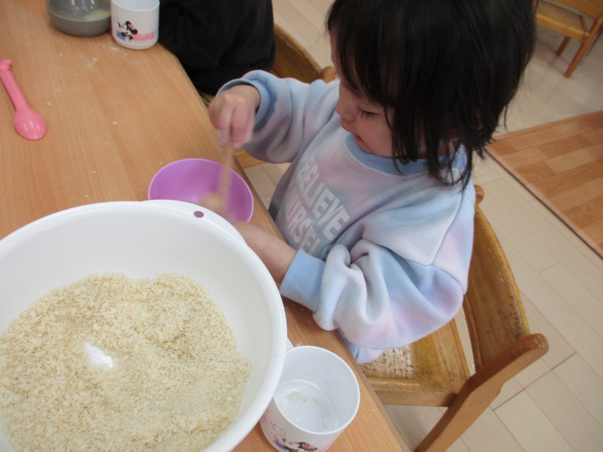 こどもの家・志木中宗岡 パン粉遊び!! らっこ組(2歳児クラス)