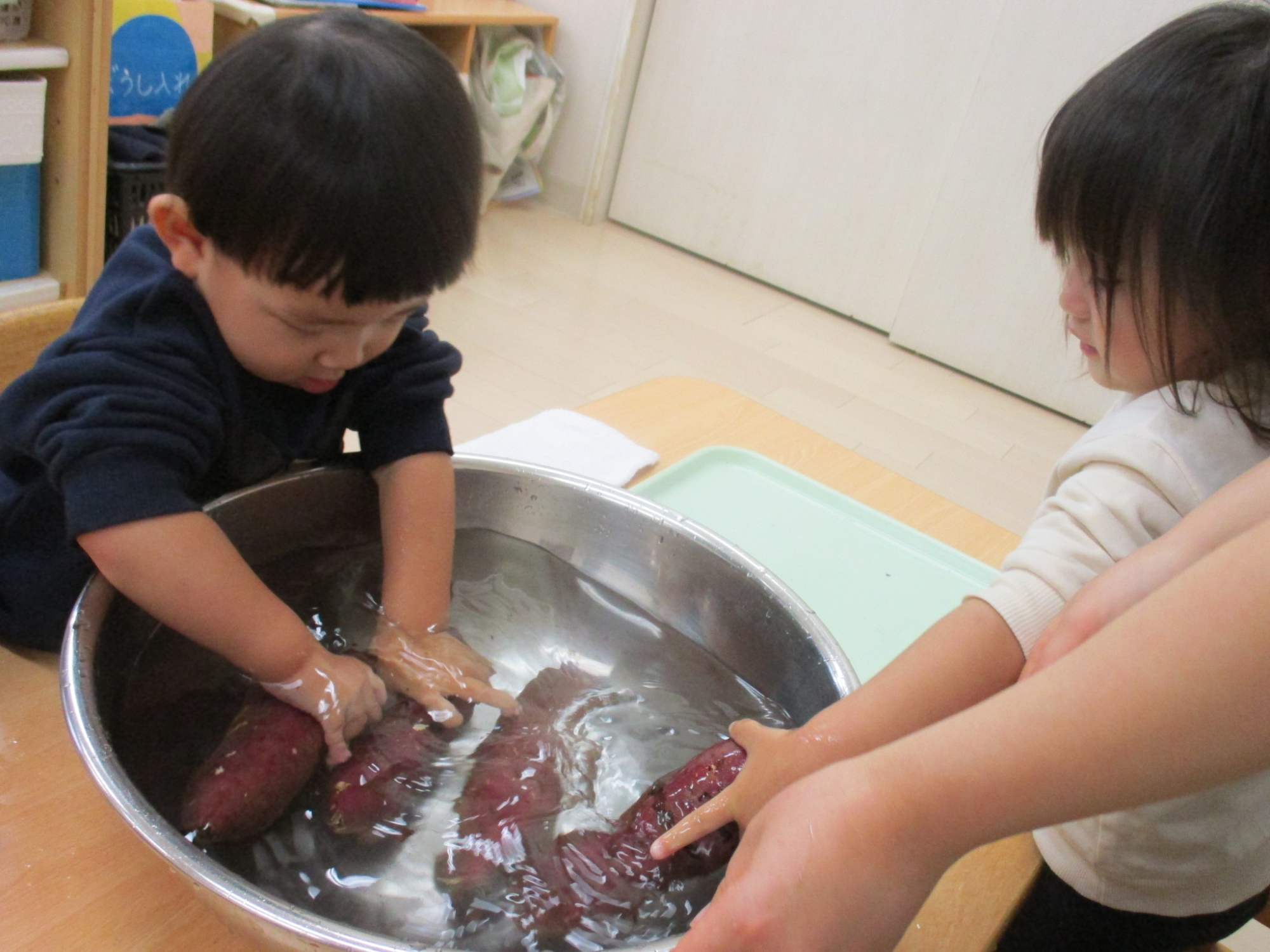 こどもの家・志木中宗岡保育園 あひる組 食育さつまいも洗い(1歳児)