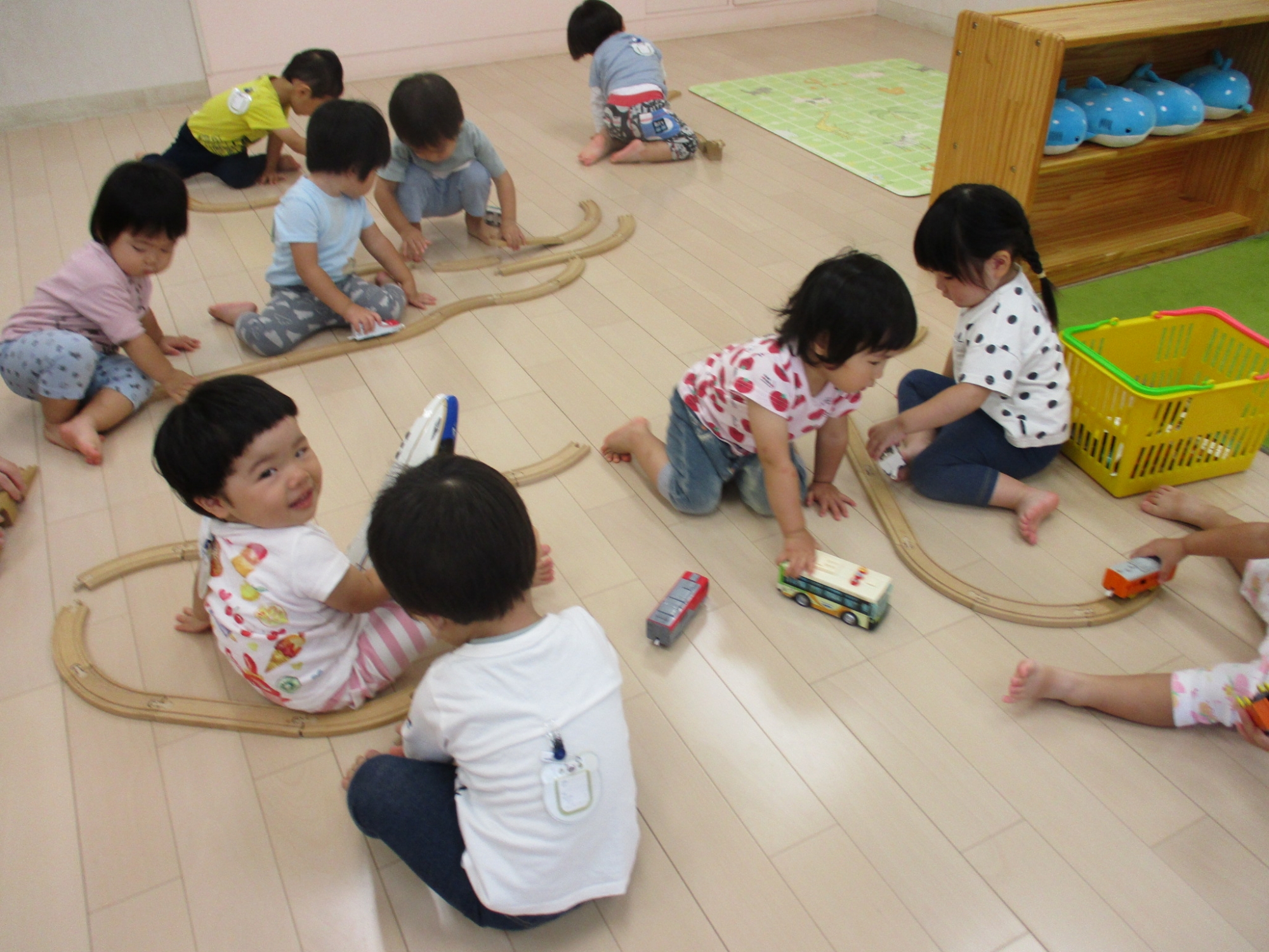 こどもの家・志木中宗岡 線路を繋げて電車遊び!!たんぽぽ組(1歳児クラス)