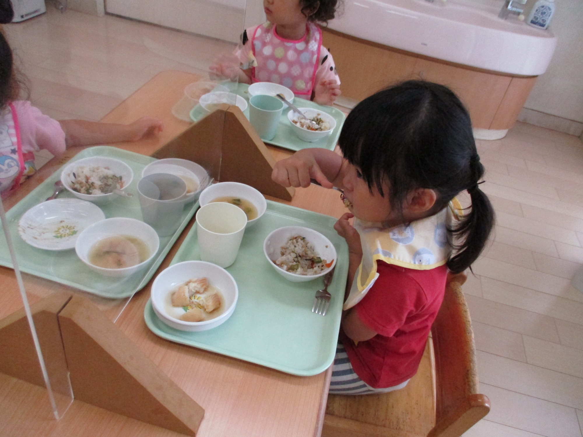 こどもの家・志木中宗岡 すみれ組(2歳児クラス) 給食おいしいね
