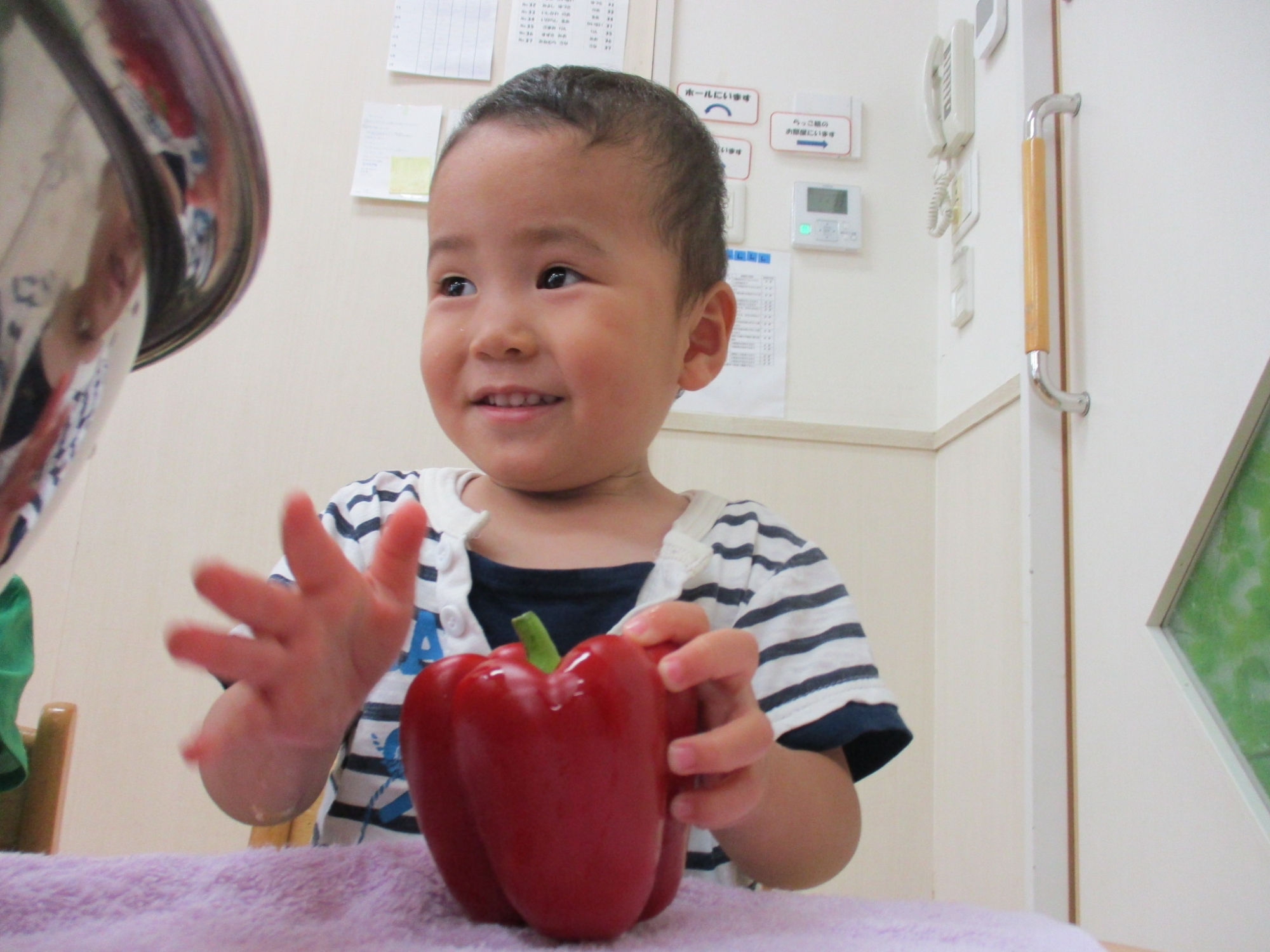 こどもの家・志木中宗岡 食育☆パプリカ洗い あひる組(1歳児)