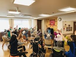 ①運動教室の実施・・トレーナーが事業所に伺いライブで運動教室。ご入居者様一人一人と目を合わせ会話するレッスン