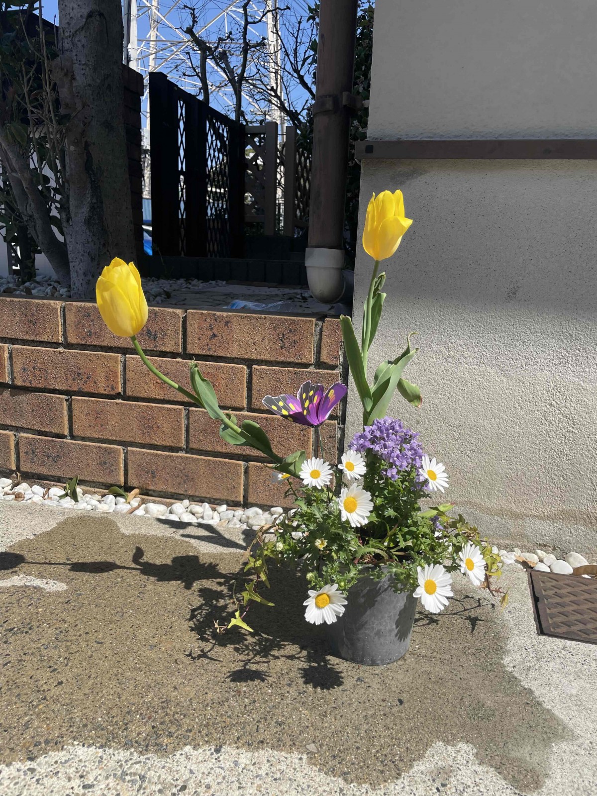 背の高いチューリップを主役にすべく頑張ってみました。蝶々は飾りで入れましたが可愛いアクセントになりました。